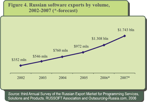 Third Annual Survey on Russian Export Software MarketSoftware Export Dynamics (a part)In 2005, software exports continued to grow at a relatively fast rate. Total export earnings for software companies grew by 28% to just shy of $1 billion - although given the margin of error the figure of $972 million could be rounded up to this significant landmark, especially as current methodology for calculating exports likely produces a lower figure than the actual one.